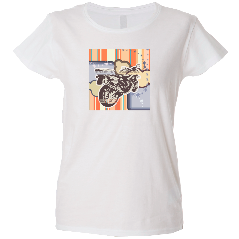 Camiseta mujer de manga corta con cinta de refuerzo en el cuello con diseño de moto rayada
