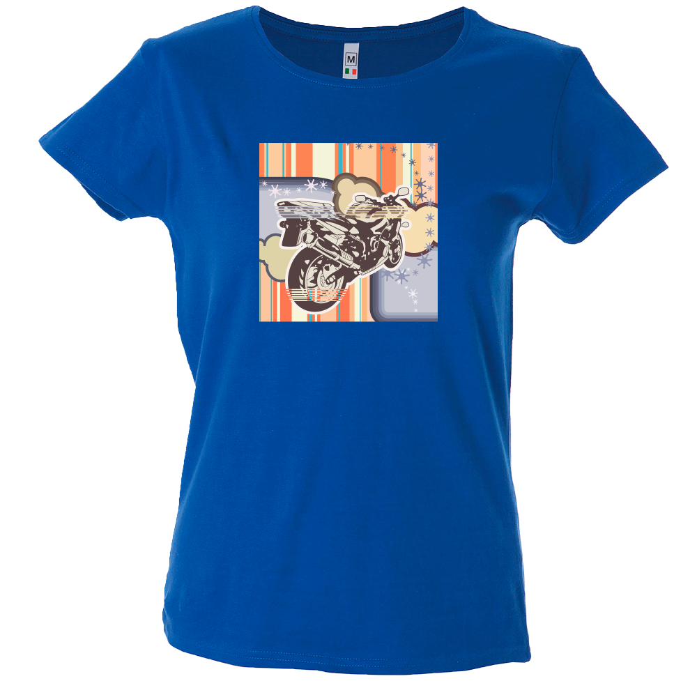 Camiseta mujer de manga corta con cinta de refuerzo en el cuello con diseño de moto rayada