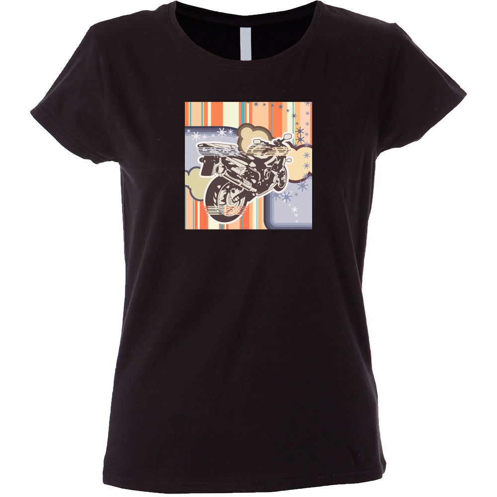 Camiseta mujer de manga corta con cinta de refuerzo en el cuello con diseño de moto rayada