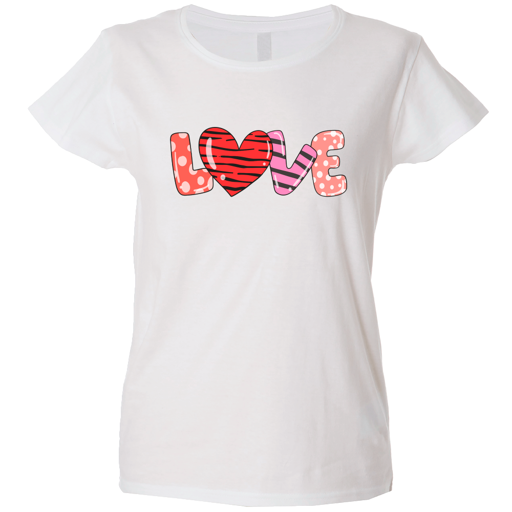 Camiseta mujer de manga corta con cinta de refuerzo en el cuello con diseño de love estampado
