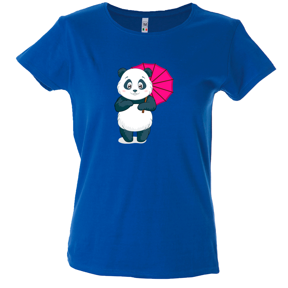 Camiseta mujer de manga corta con cinta de refuerzo en el cuello con diseño de panda paraguas
