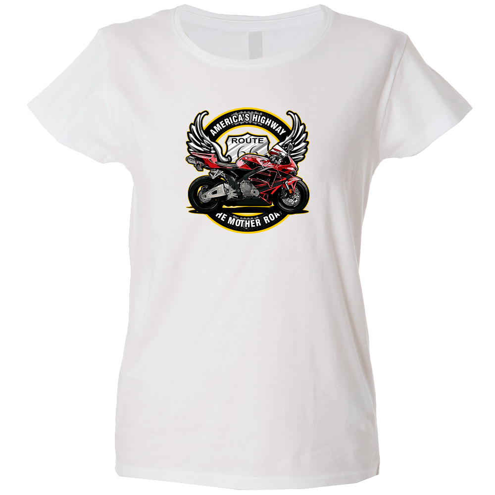 Camiseta mujer de manga corta con cinta de refuerzo en el cuello con diseño de ruta 66
