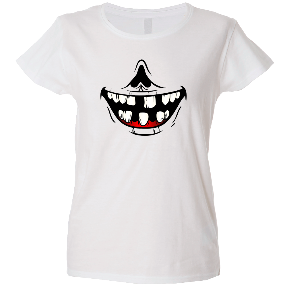 Camiseta mujer de manga corta con cinta de refuerzo en el cuello con diseño de sonrisa desdentada