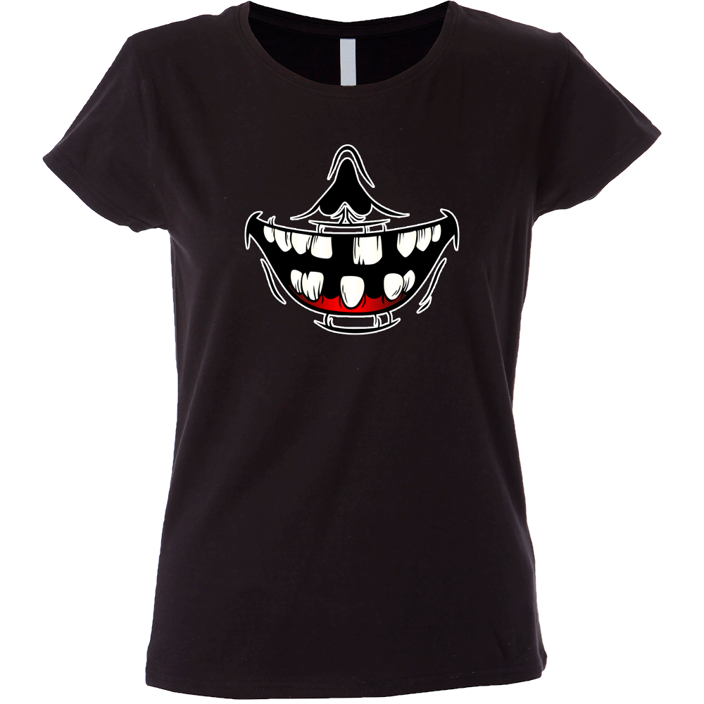Camiseta mujer de manga corta con cinta de refuerzo en el cuello con diseño de sonrisa desdentada
