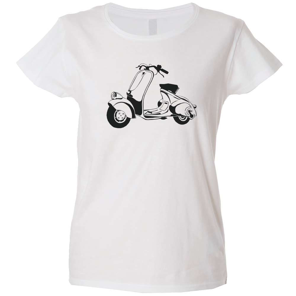 Camiseta mujer de manga corta con cinta de refuerzo en el cuello con diseño de vespa sillín bajo