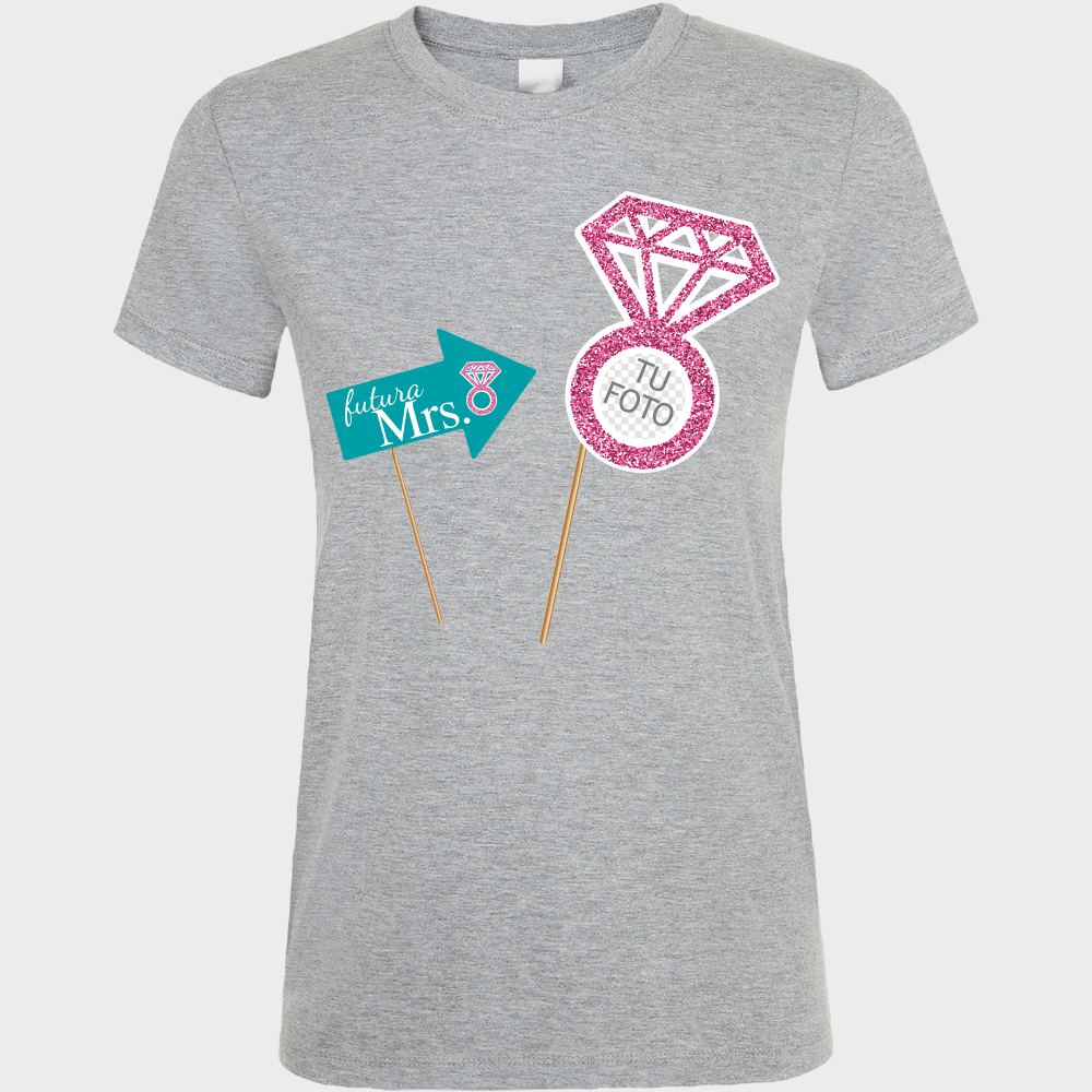 Personaliza el diseño con la foto de la novia: Puedes personalizar la camiseta con la cara de la novia. Añade el producto al personalizador, sube la foto y colócala en el recuadro correspondiente.