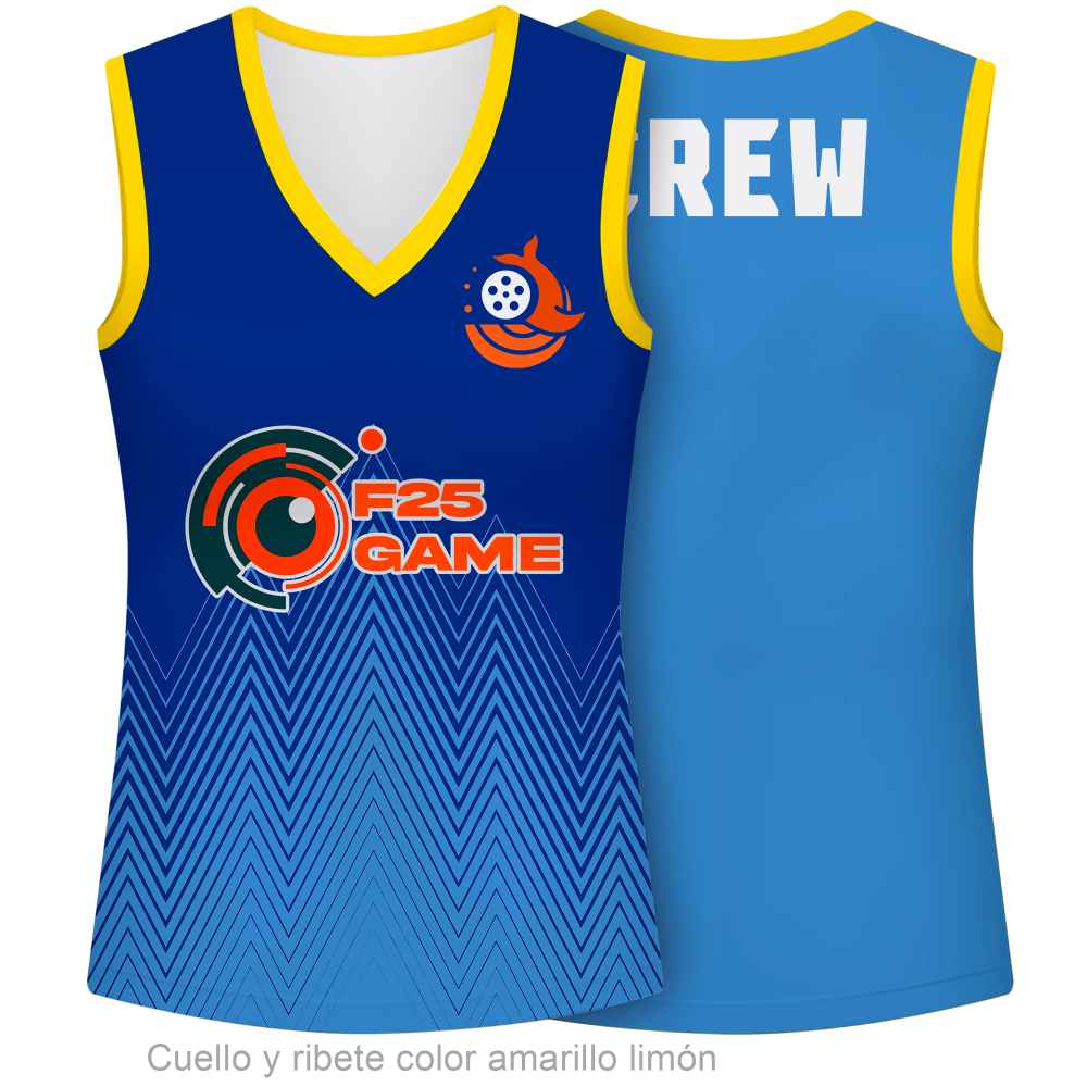Camiseta sin mangas y cuello en pico que se puede personalizar al 100% por delante y detrás. También puedes escoger el color del cuello y ribete. Ideal para eventos
