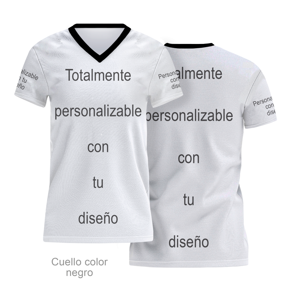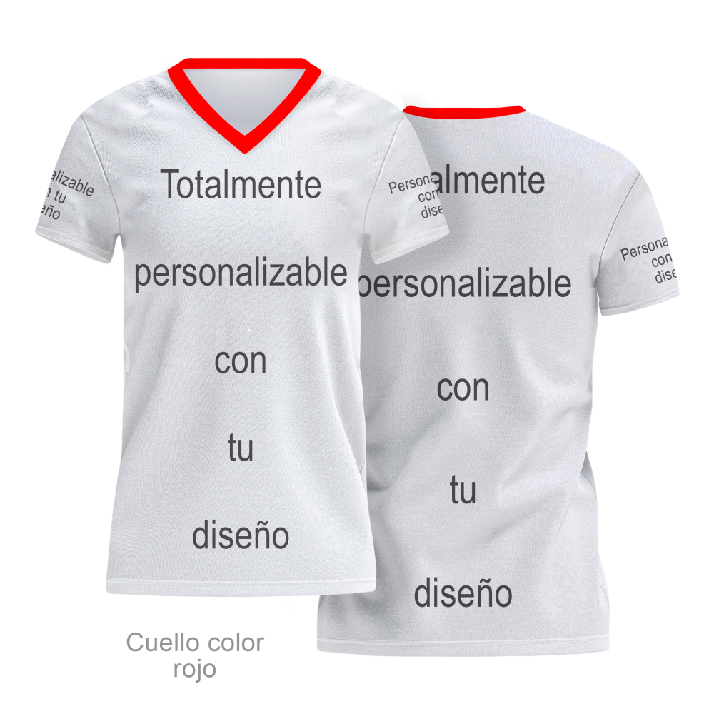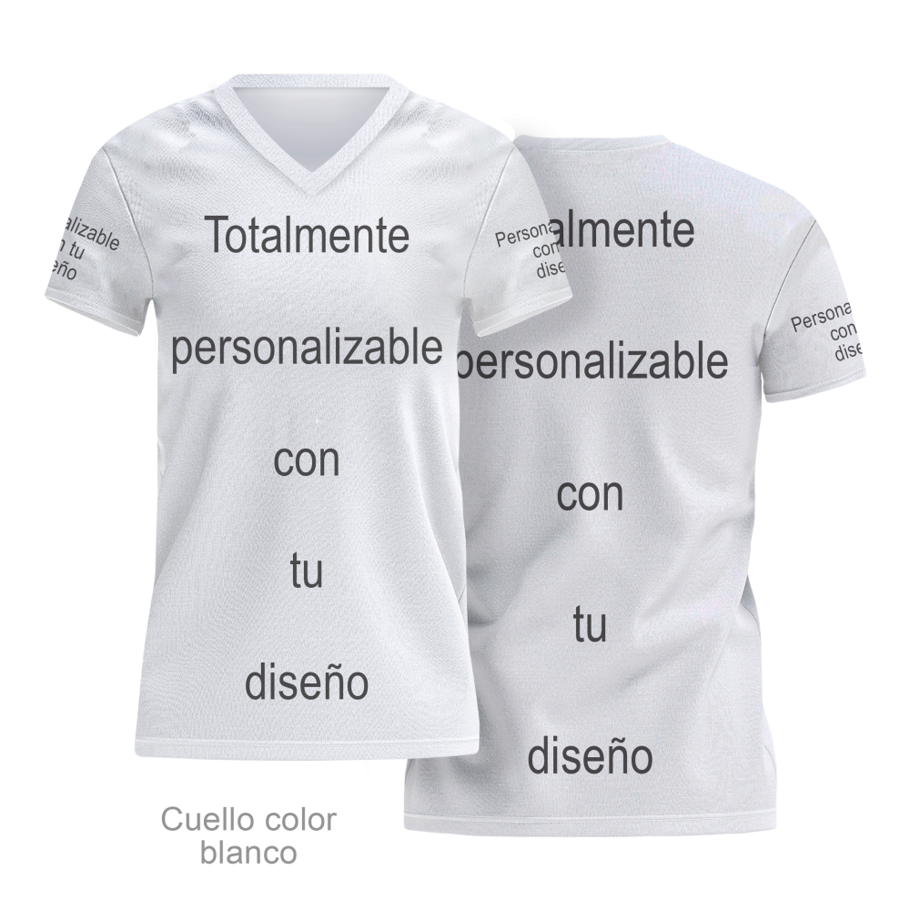 En esta prenda puedes personalizar la totalidad de la parte delantera, trasera y mangas de la camiseta. También puedes escoger el color del cuello.