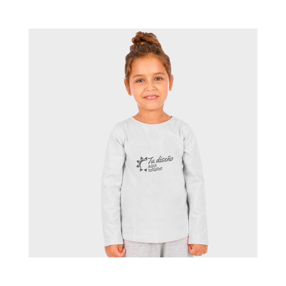 Camiseta niña manga larga, cuello redondo y estilo clásico, sin costuras laterales.