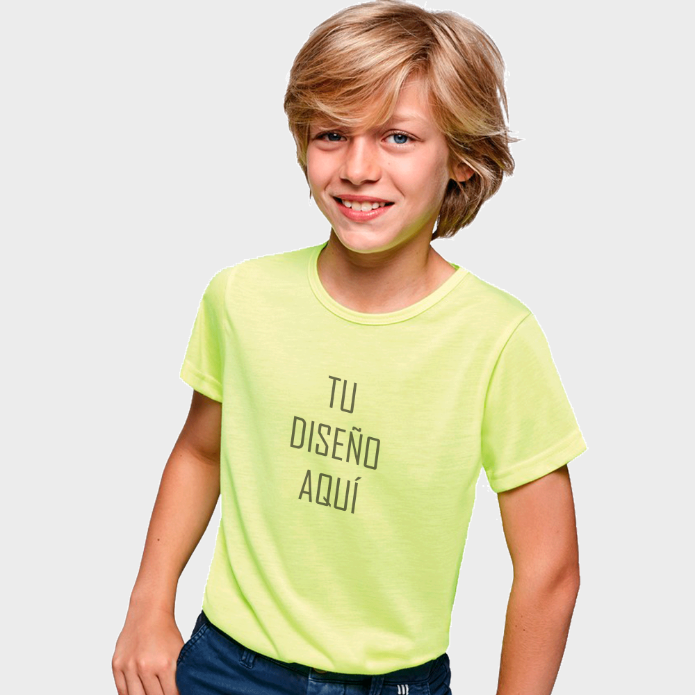 Camiseta de niño con cuello redondo y cubrecosturas de refuerzo en el interior. Fabricada en tejido poliéster con tacto algodón.