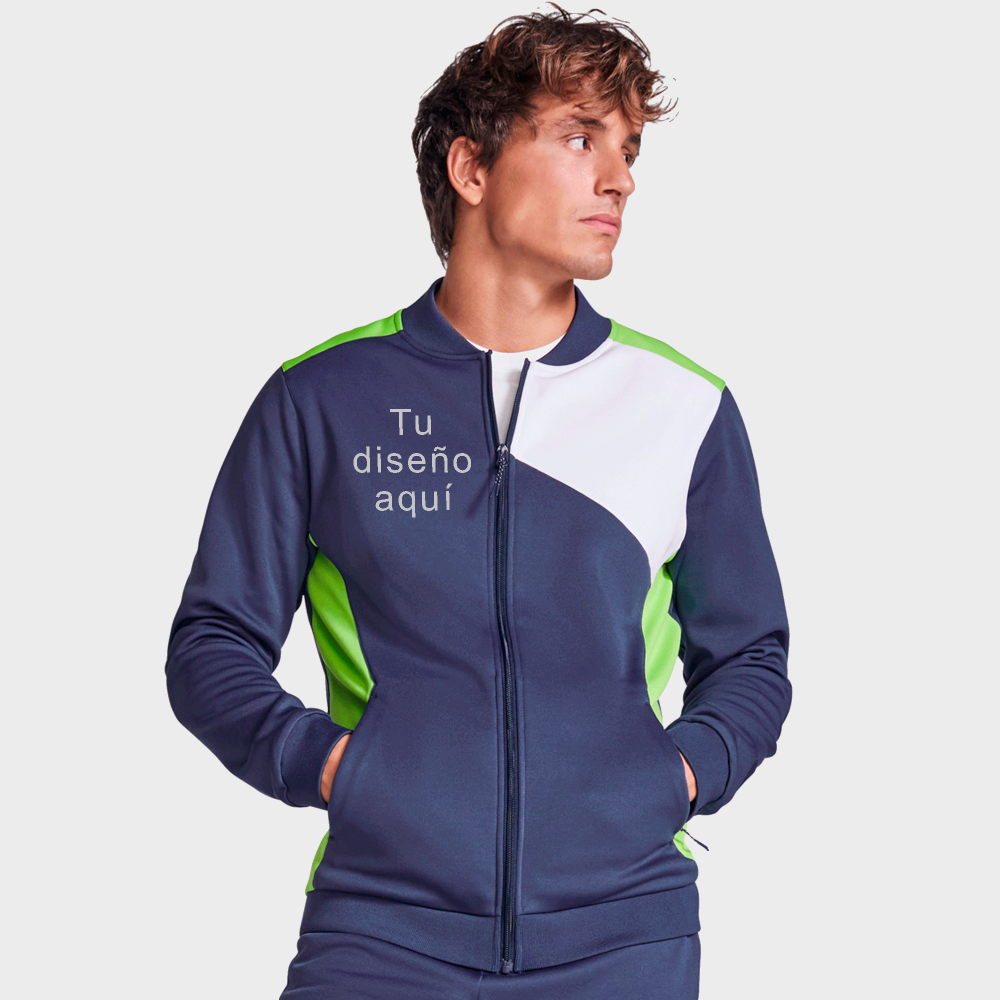 En este chándal puedes personalizar a cada lado de la cremallera, en ambas mangas y en la espalda