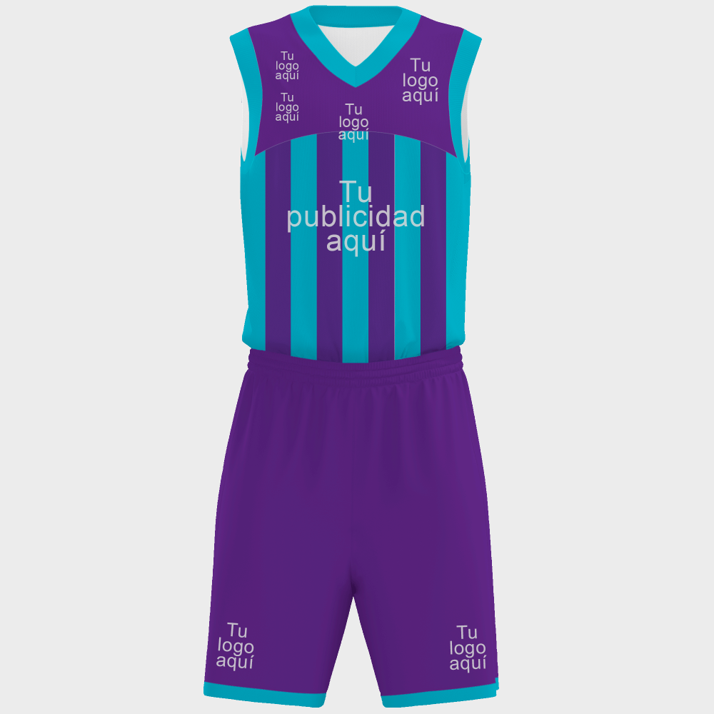 Equipación unisex ideal para actividades como baloncesto. Modelo Rayada con camiseta sin mangas y con cuello en pico y pantalón con cinturilla elástica y raya en el borde de la costura, que puedes personalizar hasta en 14 zonas diferentes.