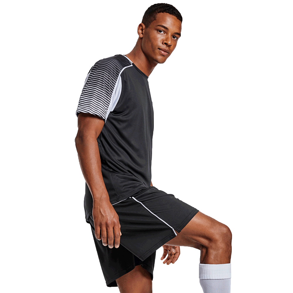 Compuesto de dos camisetas manga semi ranglan estampada y cuello redondo y pantalón con cinturilla elástica, cordón interior, banda lateral y abertura lateral. Tejido ligero y fresco para poder realizar tus actividades de deporte sin limitación de movimientos.
