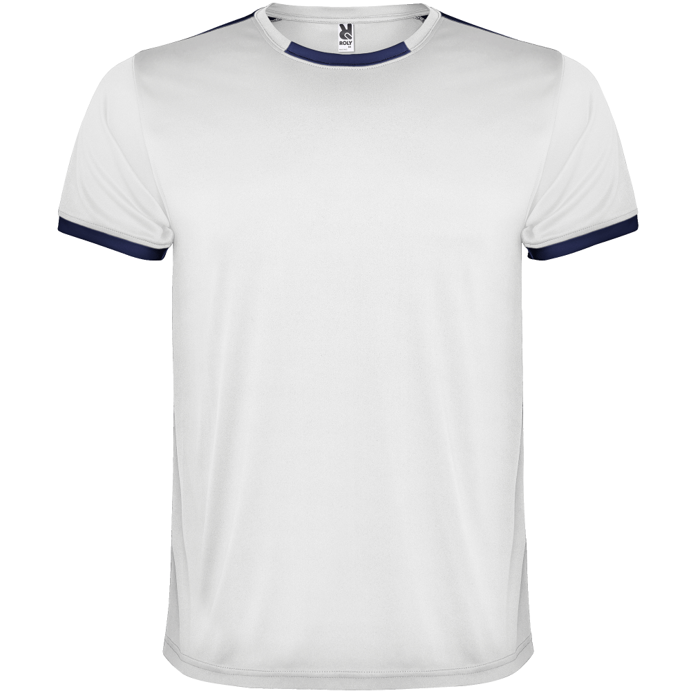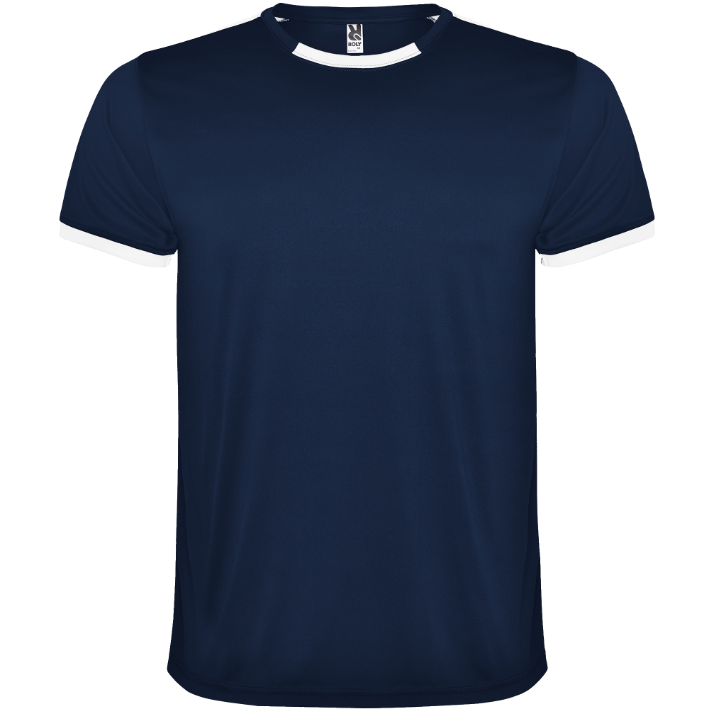 - Cuello redondo con ribete bicolor y con cubrecosturas reforzado en su interior