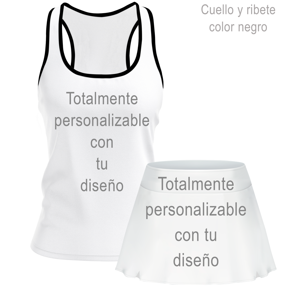 Conjunto de mujer ideal para actividades como pádel o tenis. Modelo personalizable en su totalidad por delante y por detrásTambién podrás escoger el color del cuello y ribete.