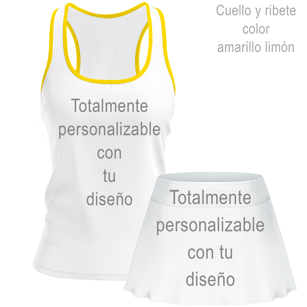 Conjunto de mujer ideal para actividades como pádel o tenis. Modelo personalizable en su totalidad por delante y por detrás. También podrás escoger el color del cuello y ribete.