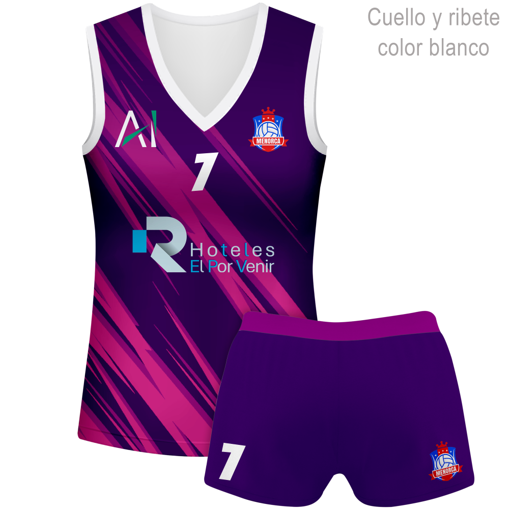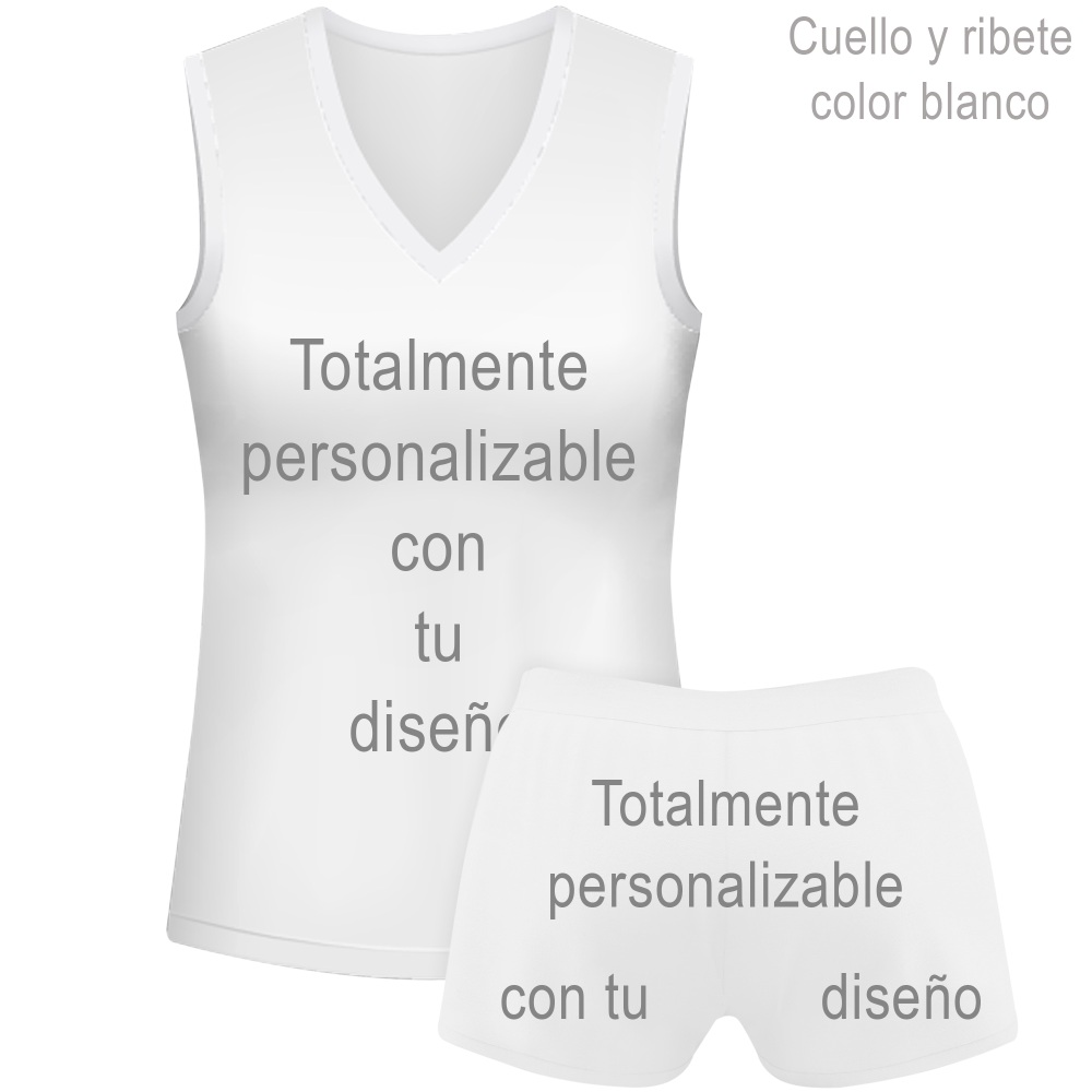 Conjunto de mujer ideal para actividades como voleibol. Modelo personalizable en su totalidad por delante y detrás. También podrás escoger el color del cuello y ribete.