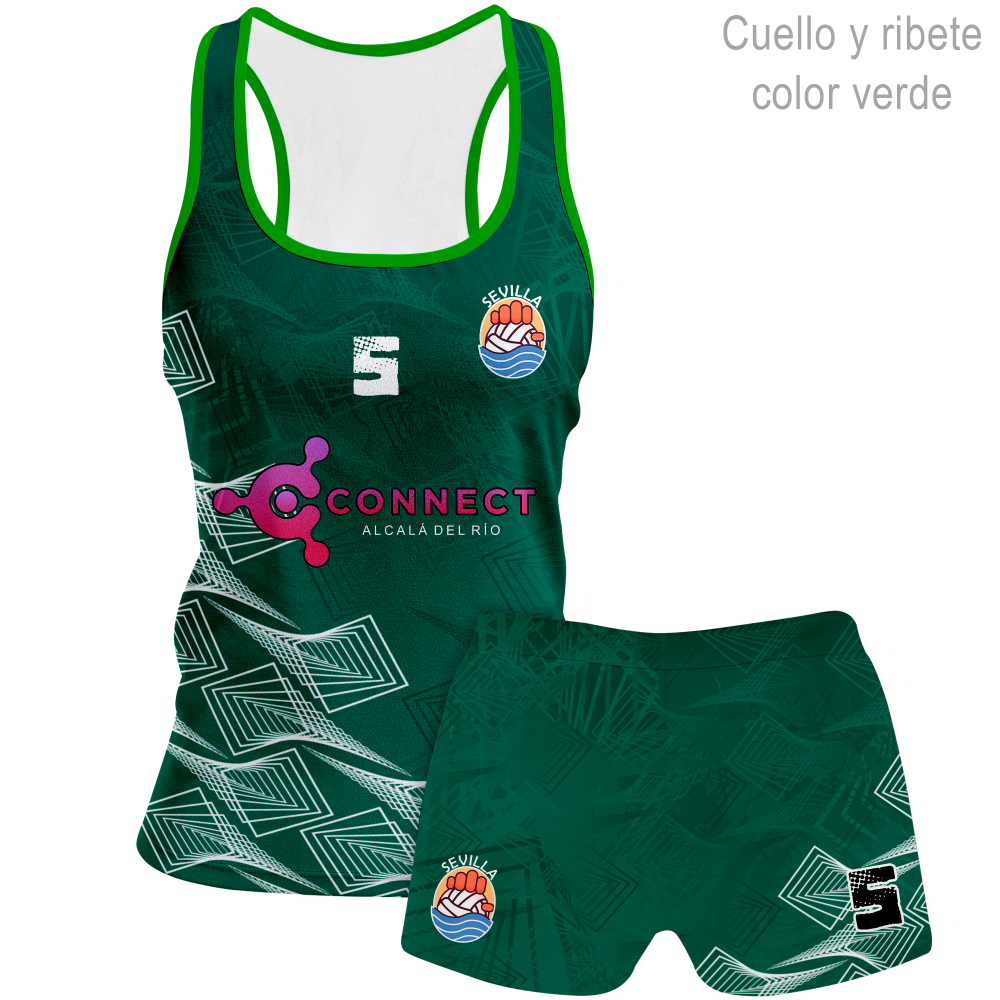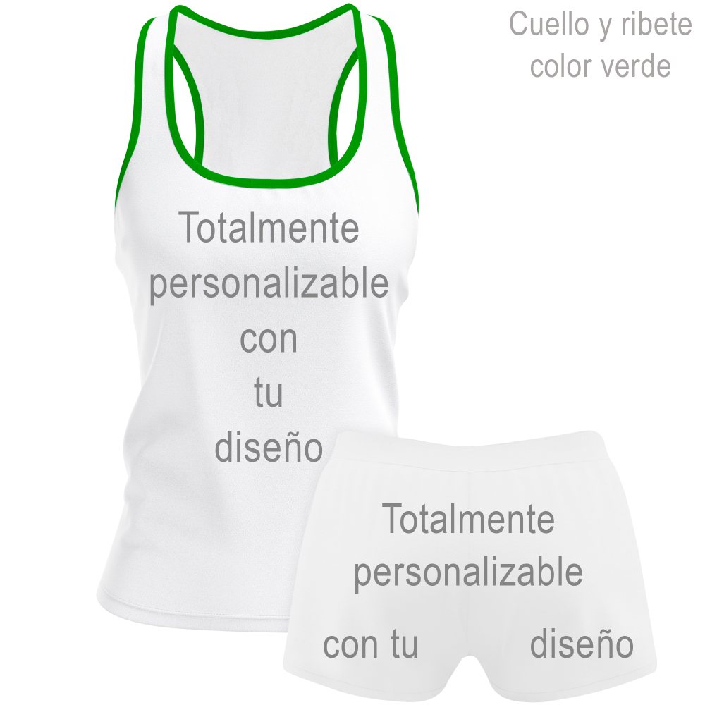 Conjunto de mujer ideal para actividades como voleibol. Modelo personalizable en su totalidad por delante y por detrás. También podrás escoger el color del cuello y ribete.