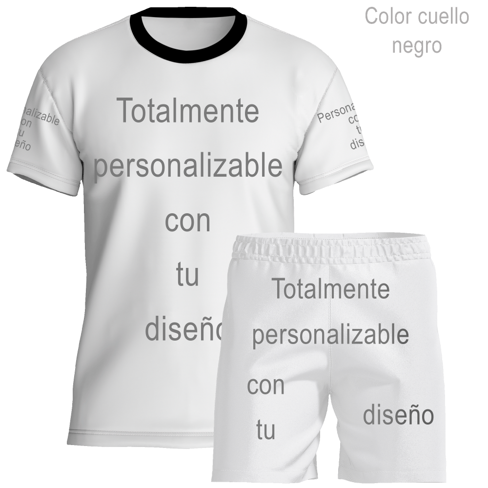 Conjunto unisex ideal para diferente tipo de deportes. Modelo personalizable en su totalidad por delante, detrás y mangas, y puedes elegir el color del cuello.