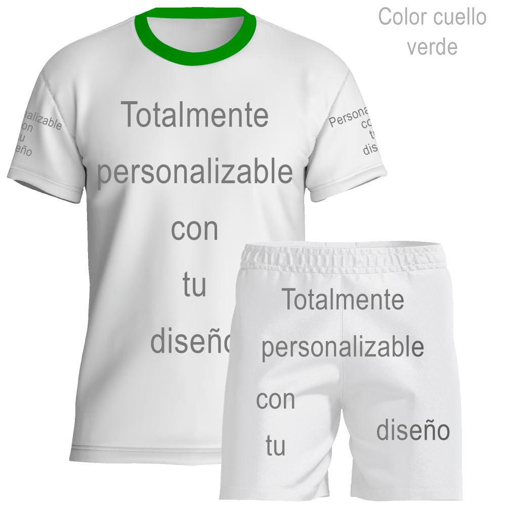 Conjunto unisex ideal para diferente tipo de deportes. Modelo personalizable en su totalidad por delante, detrás y mangas, y puedes elegir el color del cuello.
