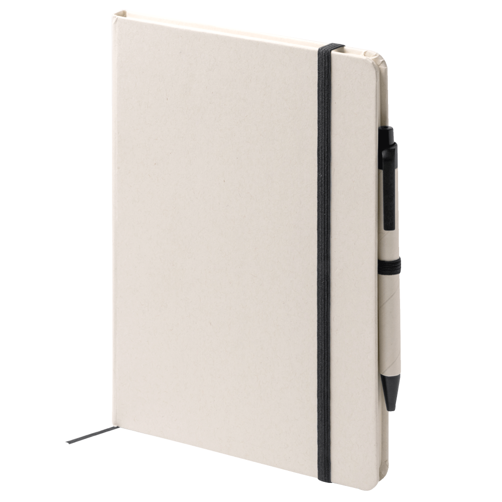 Tapa rígida con banda elástica y marca páginas, incluye bolígrafo de tinta azul