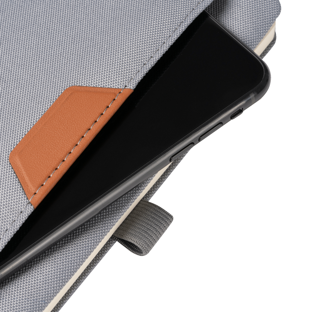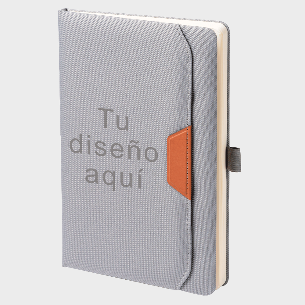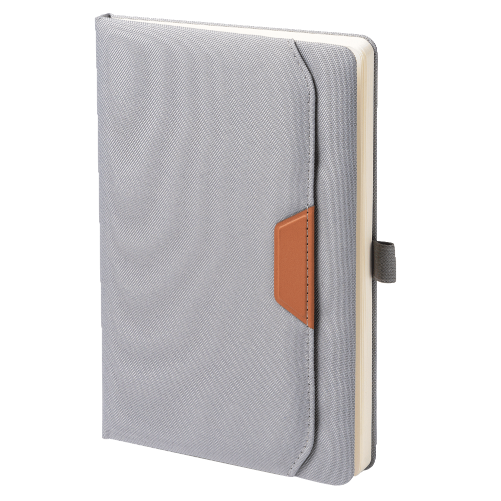 Bloc de notas A5 (16,5x22,5x2,5 cm) de tapa rígida de RPET 600D y PU Leather con bolsillo exterior.