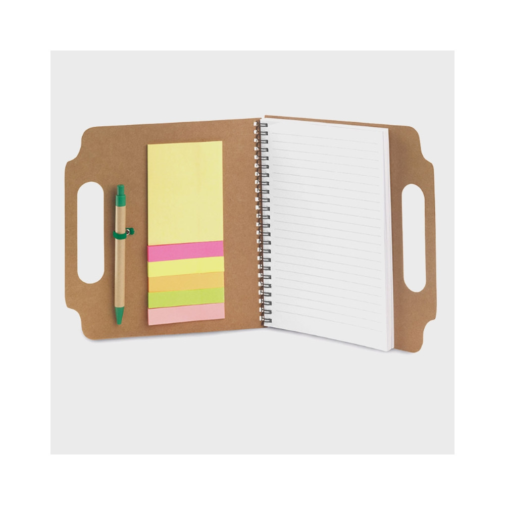 Cuaderno de anillas de rayas con tapas de cartón reciclado de tacto suave. Incluye bolígrafo, notas adhesivas medianas y mini notas adhesivas en 5 colores distintos.