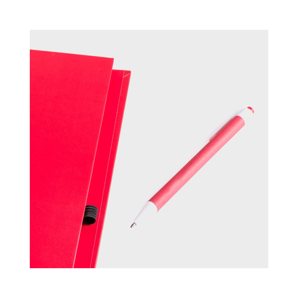 Libreta de anillas con tapa rígida y suave de cartón resistente. Completamente personalizable, disponible en 8 colores y viene a juego con un bolígrafo de cartón reciclado.