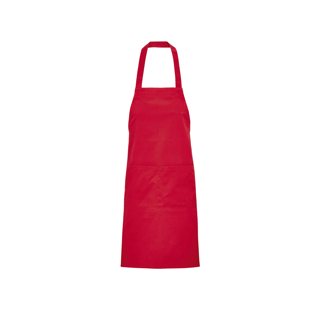 Delantal de sarga con 240g/m2 y 100% algodón biológico. Tiene un amplio bolsillo delantero con 2 compartimentos y una tira de cuello ajustable con botón y ojales. Disponible en 10 colores.