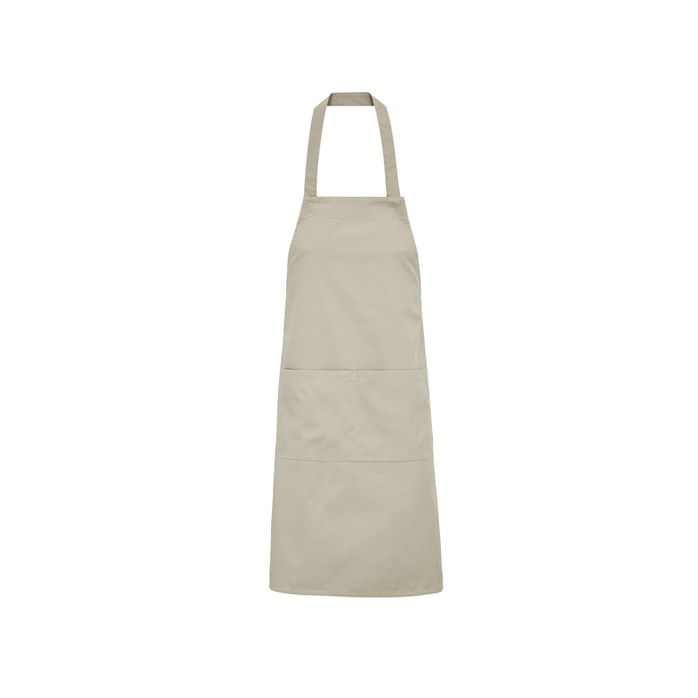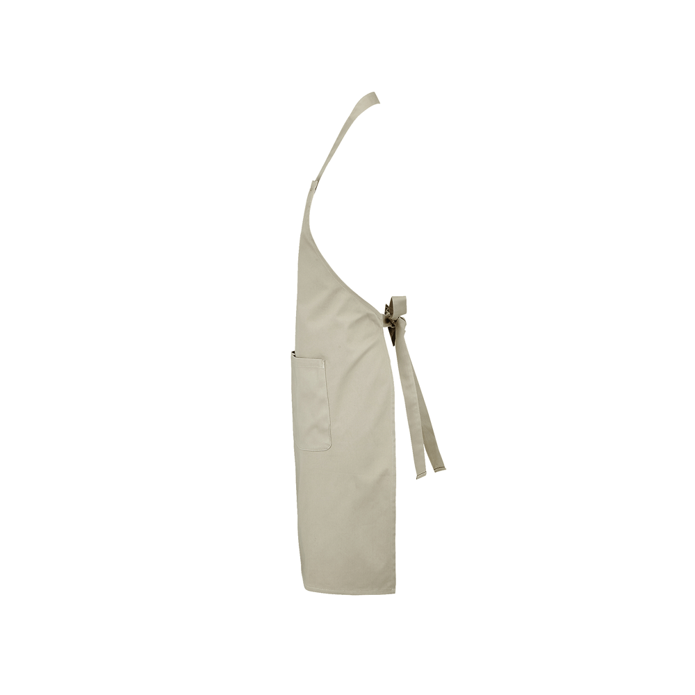 Delantal de sarga con 240g/m2 y 100% algodón biológico. Tiene un amplio bolsillo delantero con 2 compartimentos y una tira de cuello ajustable con botón y ojales. Disponible en 10 colores.