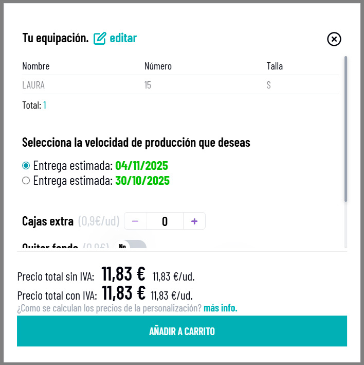 Cuando las tengas todas dale al botón de Añadir al carrito y listo. En el carrito te aparecerá el número de equipaciones que vas a personalizar.