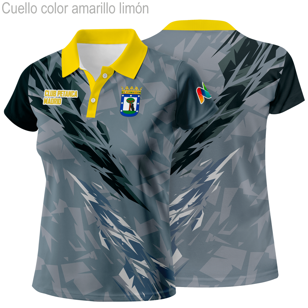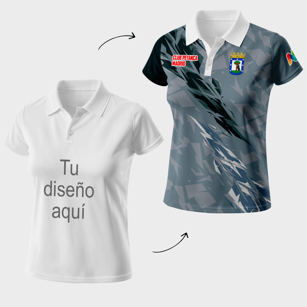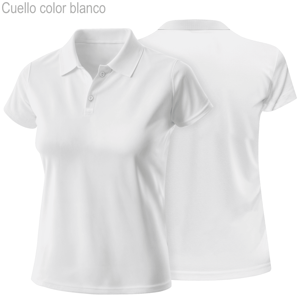 Polo de mujer ideal para actividades como petanca. Modelo personalizable en su totalidad por delante, detrás y mangas. También podrás escoger el color del cuello.