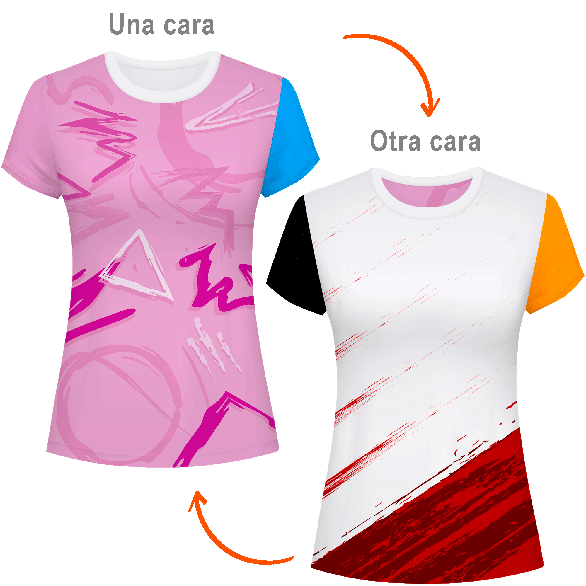 Camiseta reversible ideal para todo tipo de actividades y deportes. Modelo IBIZA de manga corta y con cuello redondo contrastado que se puede personalizar al 100% por delante, detrás, mangas y cara externa e interna de la camiseta. También, puedes escoger el color del cuello.