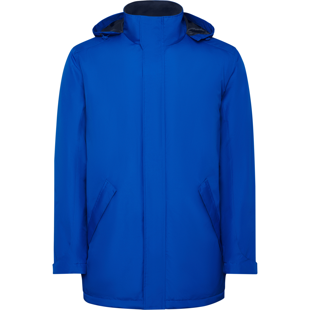 Parka acolchada de tejido impermeable a prueba de viento. Cuello alto con capucha plegable y cierre de velcro