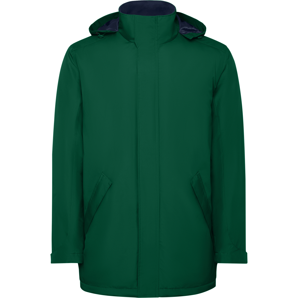 Parka acolchada de tejido impermeable a prueba de viento. Cuello alto con capucha plegable y cierre de velcro