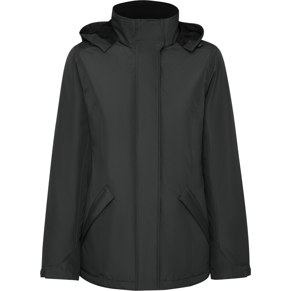 Parka acolchada de tejido impermeable a prueba de viento. Cuello alto con capucha plegable y cierre de velcro