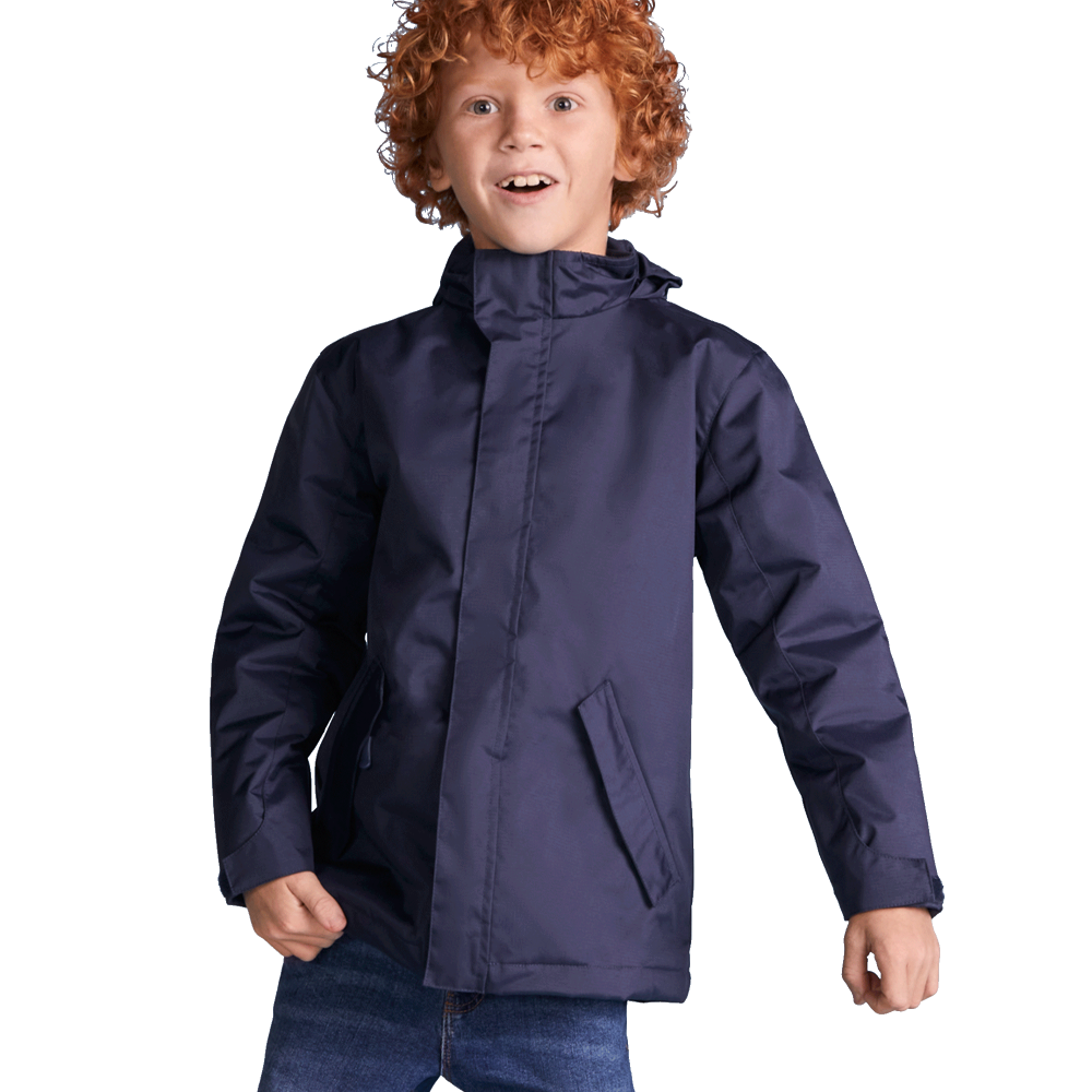 Parka acolchada para niños de tejido impermeable a prueba de viento. Cuello alto con capucha plegable y cierre de velcro