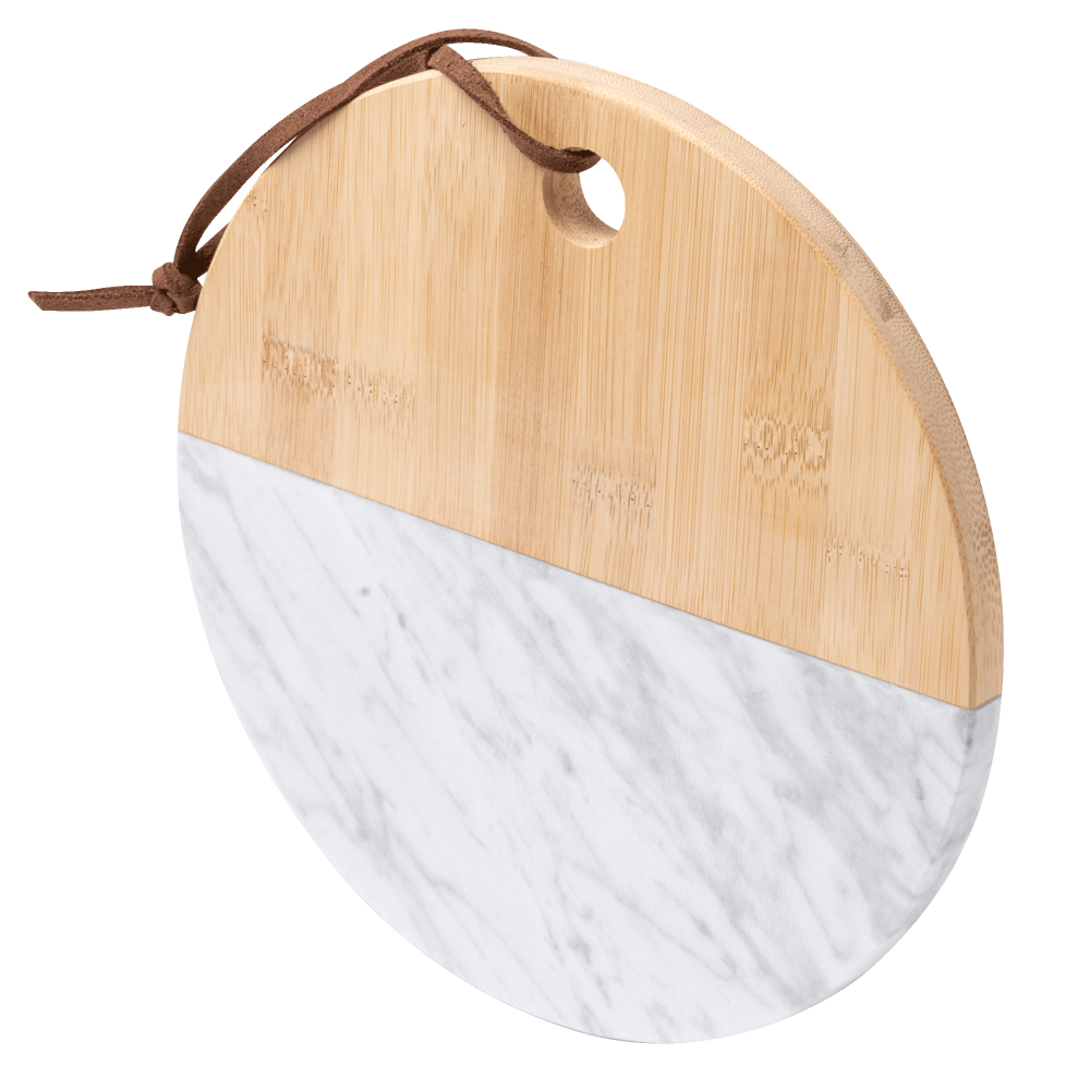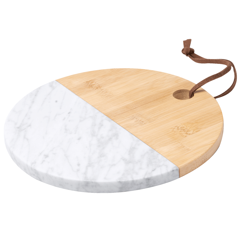 Tabla realizada en bambú y mármol natural e incluye una cinta de transporte en polipiel
