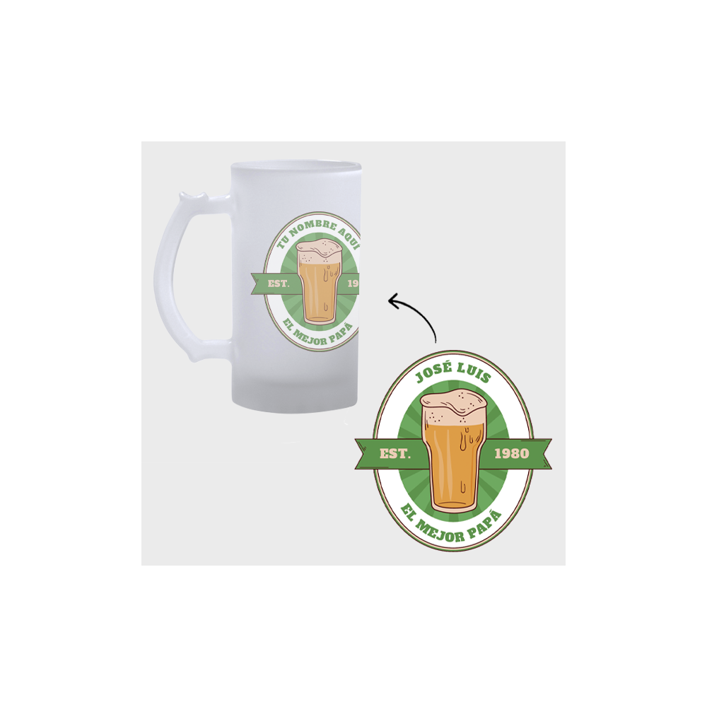 Jarra de cerveza de cristal con efecto hielo con capacidad de 500ml con un diseño de etiqueta de cerveza. Podrás saborear tu bebida favorita bien fría mientras ves el fútbol o disfrutas de una tarde tranquila con amigos en casa.