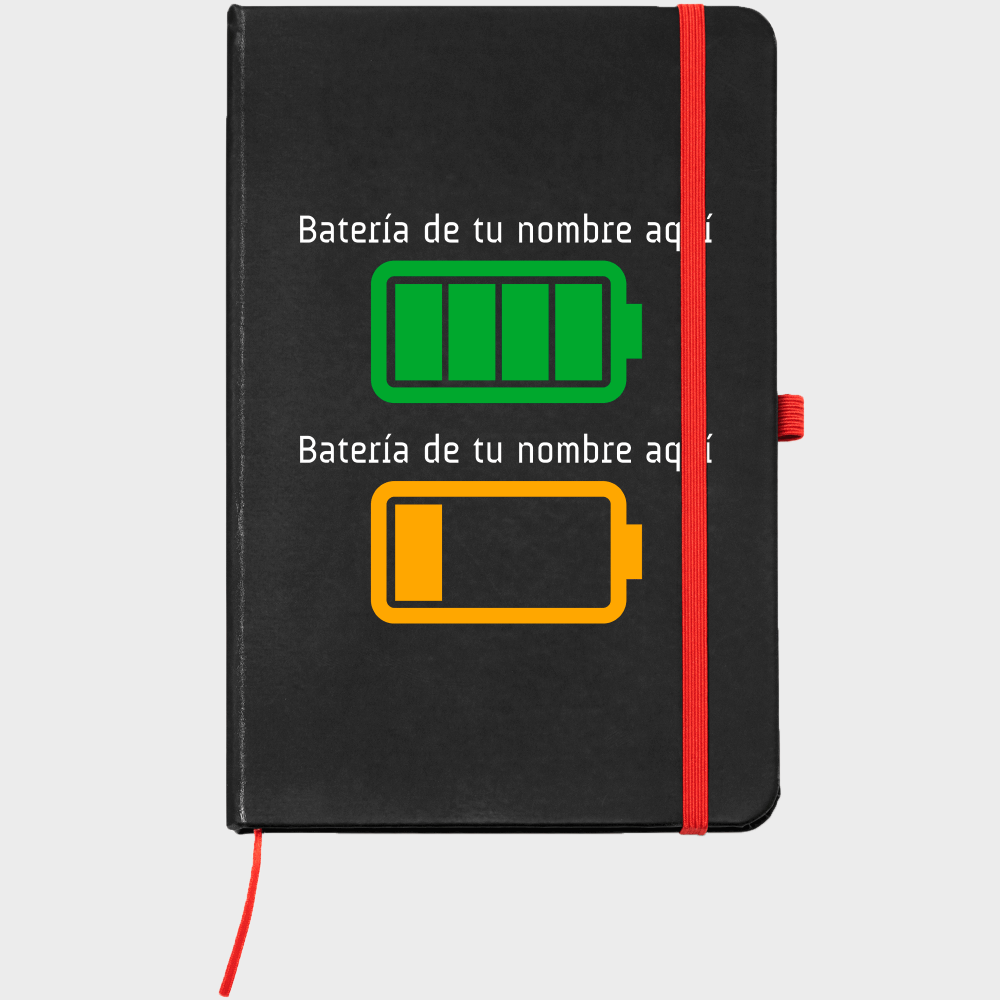 Bloc de notas A5 con tapa rígida de PU negro de 80 hojas rayadas. Marcapáginas y banda elástica de cierre y soporte para bolígrafo a color,