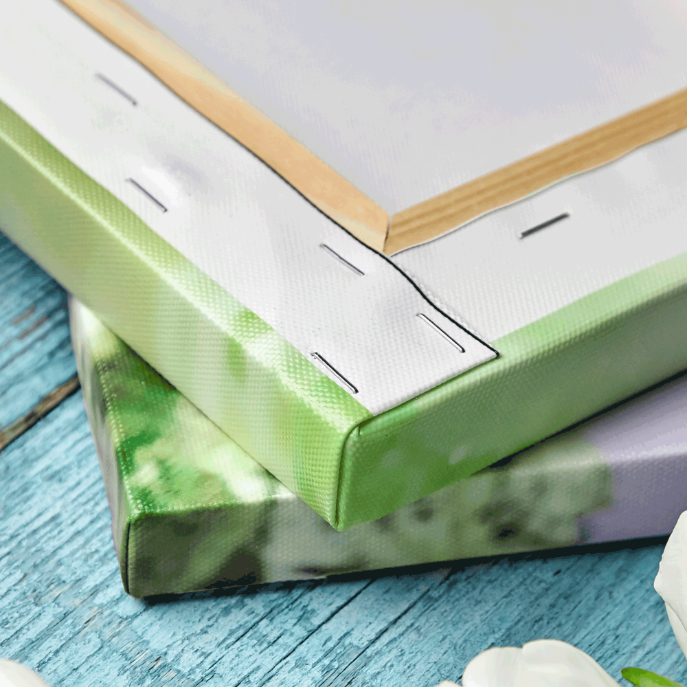 El lienzo personalizado te lo enviamos ya montado, tensado y sujeto con grapas apropiadas a este uso, clavadas en el bastidor. Los bastidores están encajados y reforzados con cola industrial de carpintero.
