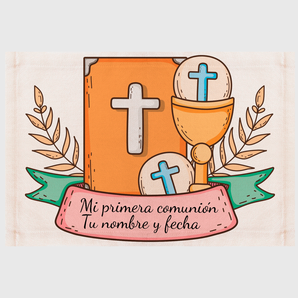 Este mantel lo puedes personalizar con el nombre y la fecha de la comunión. Indícanos en los comentarios el nombre y/o fecha que quieras que imprimamos. Si no nos indicas nada, imprimiremos solo la ilustración.