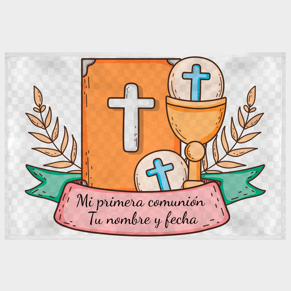 Este mantel lo puedes personalizar con el nombre y la fecha de la comunión. Indícanos en los comentarios el nombre y/o fecha que quieras que imprimamos. Si no nos indicas nada, imprimiremos solo la ilustración.