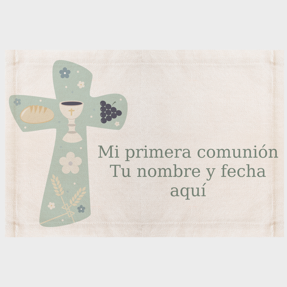Este mantel lo puedes personalizar con el nombre y la fecha de la comunión. Indícanos en los comentarios el nombre y/o fecha que quieras que imprimamos. Si no nos indicas nada, imprimiremos solo la ilustración.