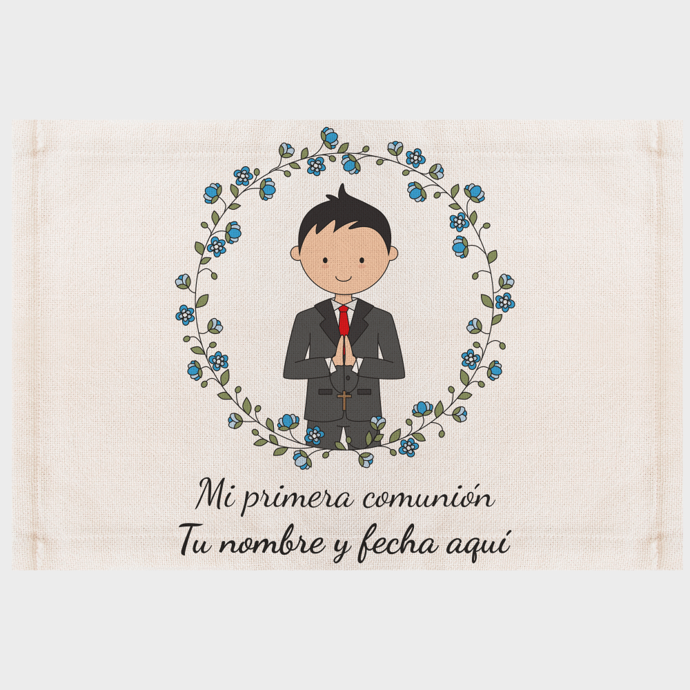 Este mantel lo puedes personalizar con el nombre y la fecha de la comunión. Indícanos en los comentarios el nombre y/o fecha que quieras que imprimamos. Si no nos indicas nada, imprimiremos solo la ilustración.