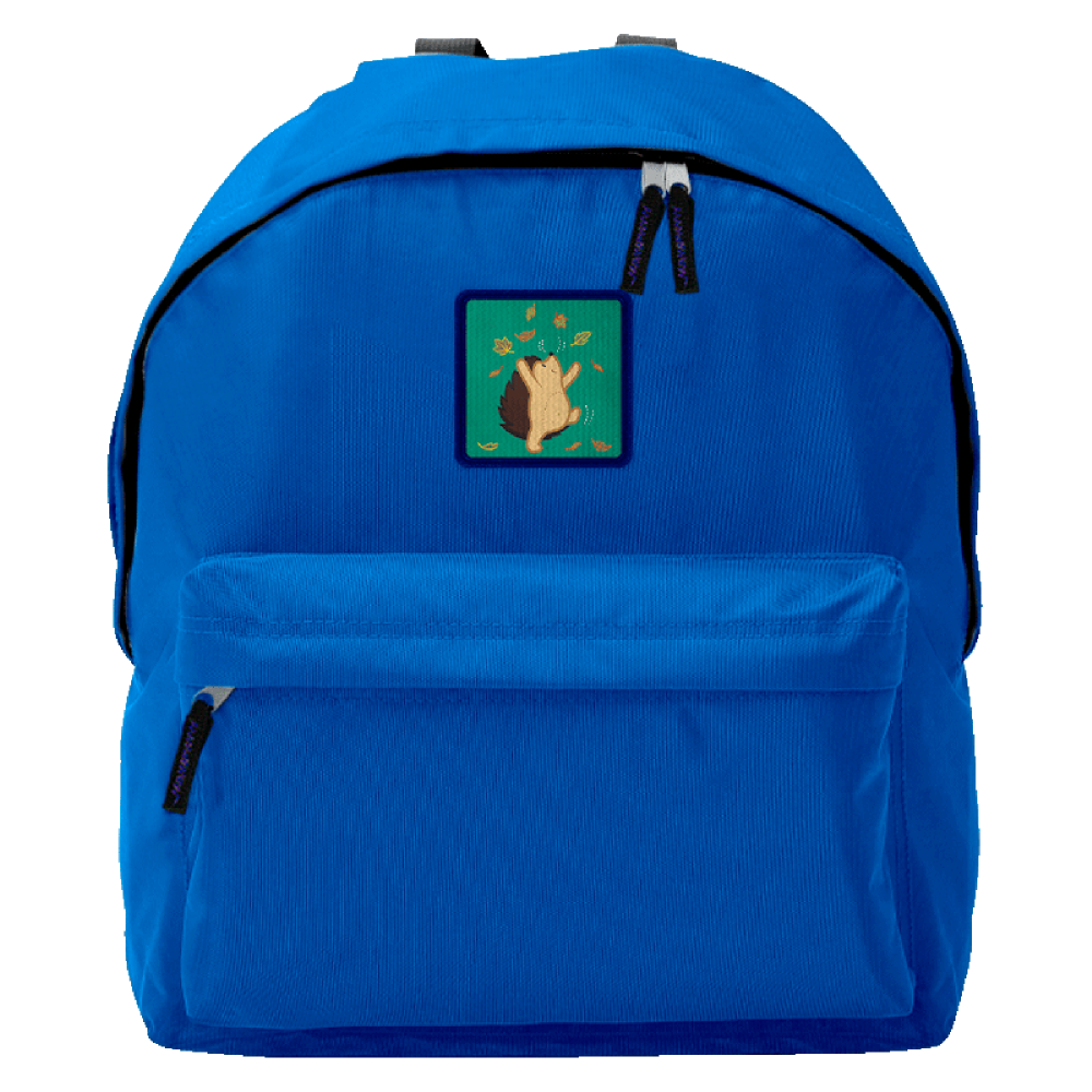 El parche es de stick con acabado semi mate y contorno de DTF Eco Flock color negro (marino en el caso de la mochila color azul royal) para mejorar su agarre