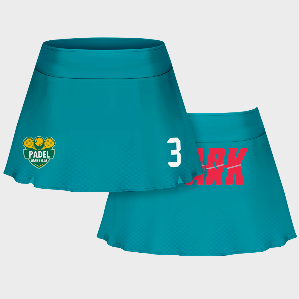 Falda pantalón ideal para actividades como pádel. Modelo Abuya con bolsillo interior para pelota en la malla que puedes personalizar en 3 zonas diferentes.