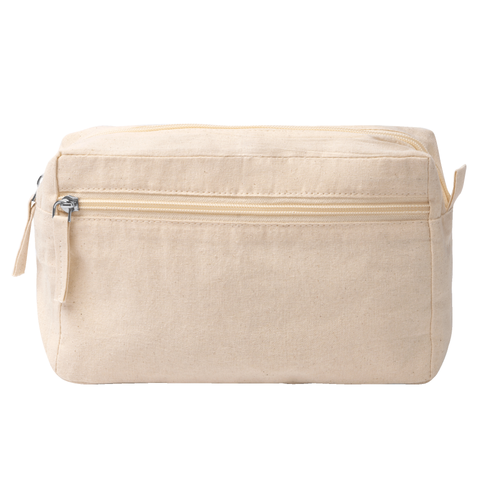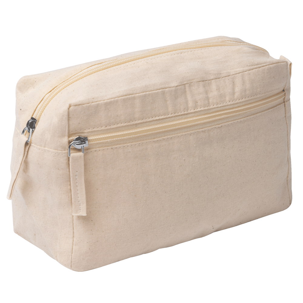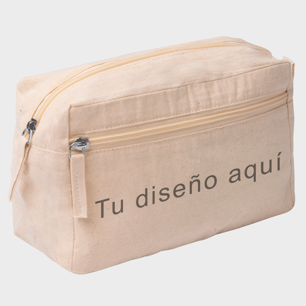 Neceser 100% algodón con un gramaje de 150 g/m2. Tiene doble bolsillo (principal y lateral) con cierre de cremallera