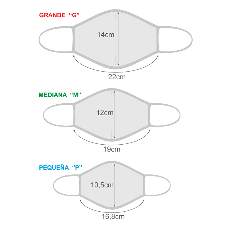 Esta mascarilla es de tamaño grande, si crees que te quedarían mejor otras medidas, mira la mascarilla pequeña o la mascarilla mediana.