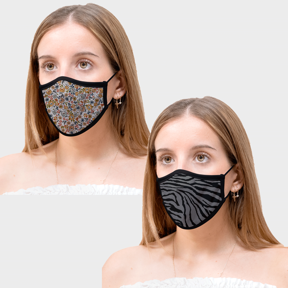 Mascarilla algodón orgánico reversible mediana ditsy flower grey y zebra black homologada con protección +90%